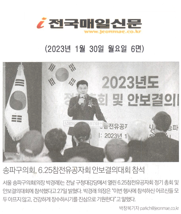 14579 | 박경래, 6·25참전유공자회 송파지회 정기총회 참석[송파타임즈] | 송파구의회 | 2023.01.26 | 1100 |